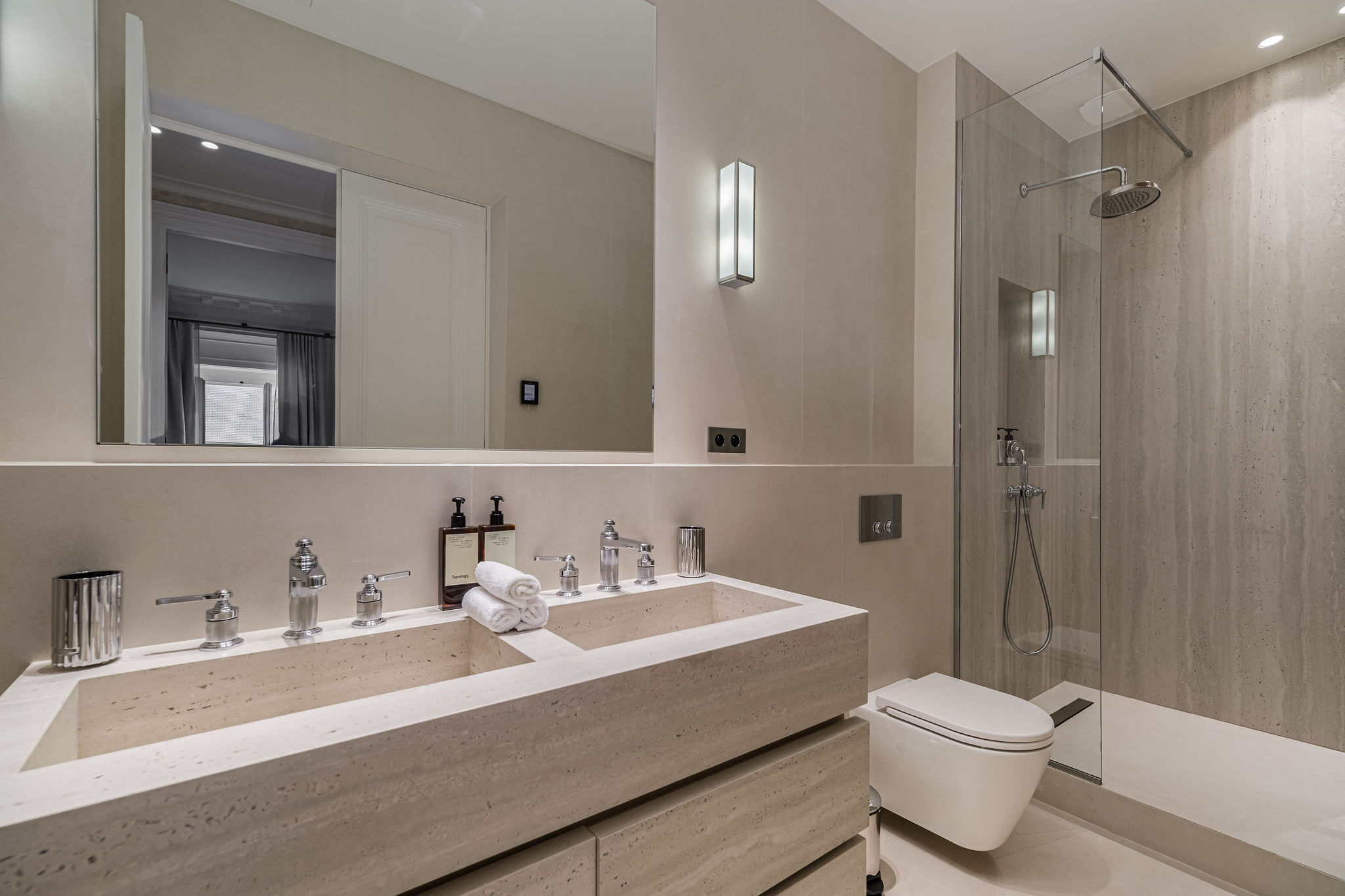 The second bedroom features a queen-size bed and elegant bathroom. Additional guest WC, hotel-quality bedding and linens, premium amenities, and daily housekeeping ensure an exceptional stay in the heart of Paris.