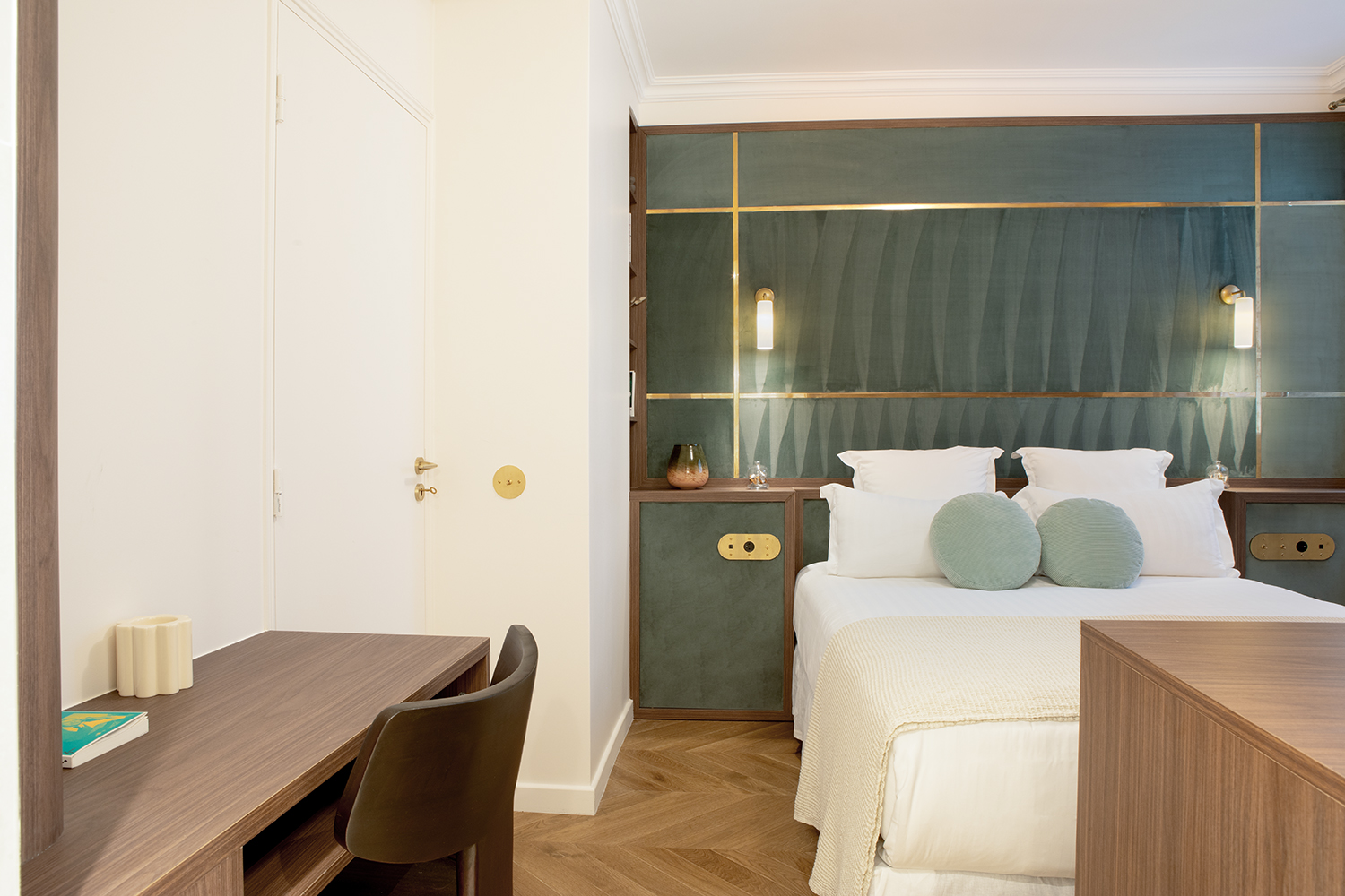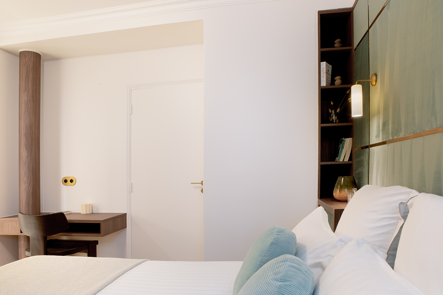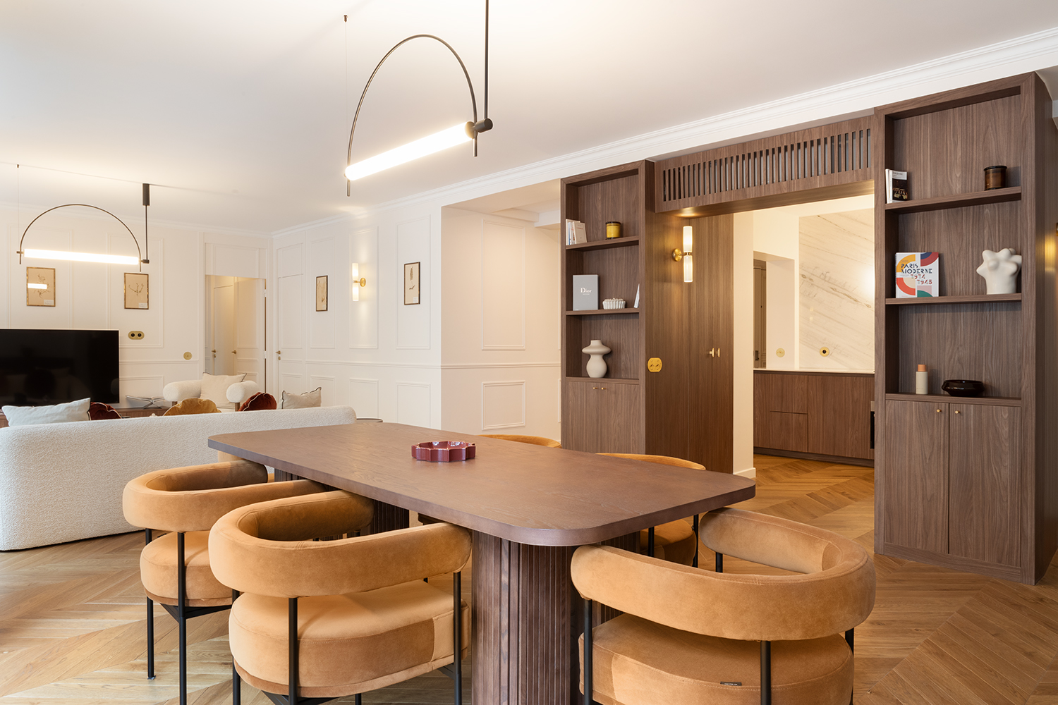 The apartment is distinguished by its generous proportions and the use of fine materials. The herringbone parquet flooring, bespoke woodwork and high ceilings are reminiscent of the prestige of Parisian apartments of yesteryear.