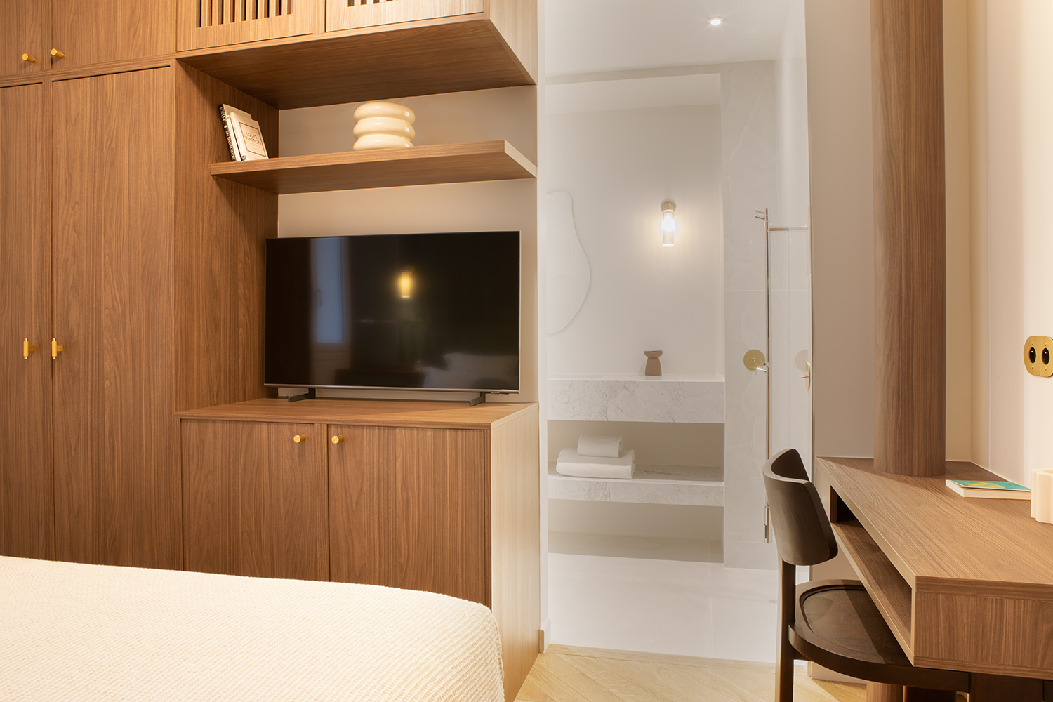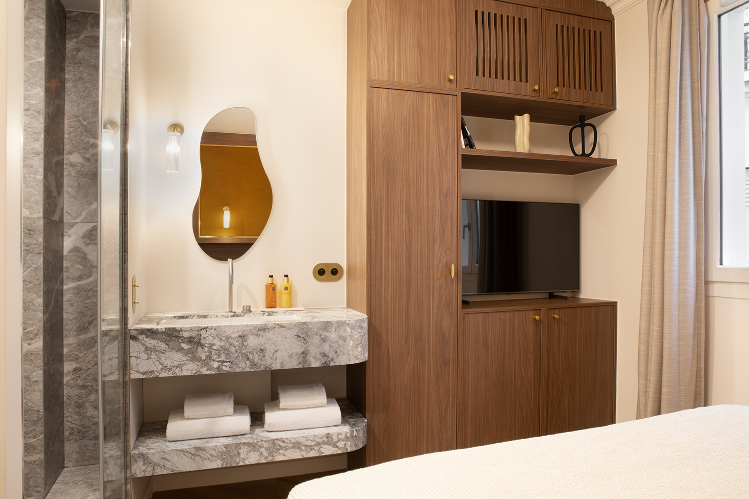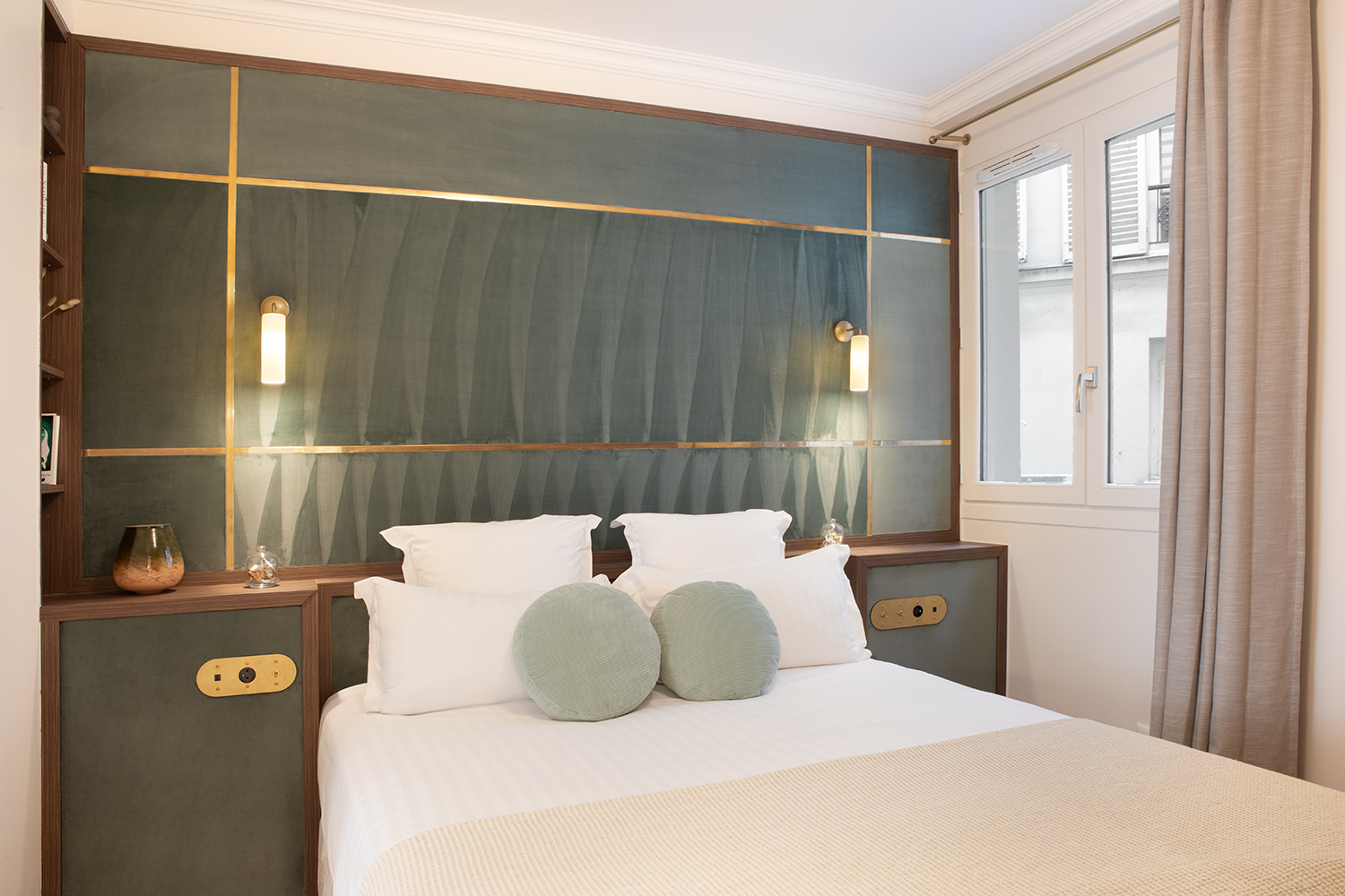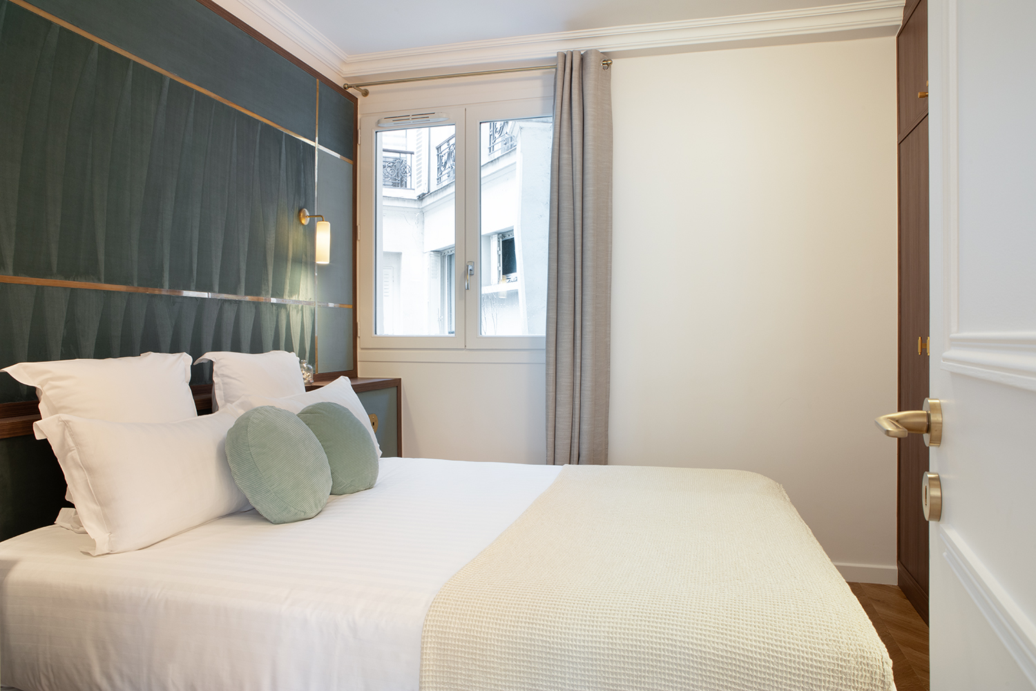 The apartment is distinguished by its generous proportions and the use of fine materials. The herringbone parquet flooring, bespoke woodwork and high ceilings are reminiscent of the prestige of Parisian apartments of yesteryear.