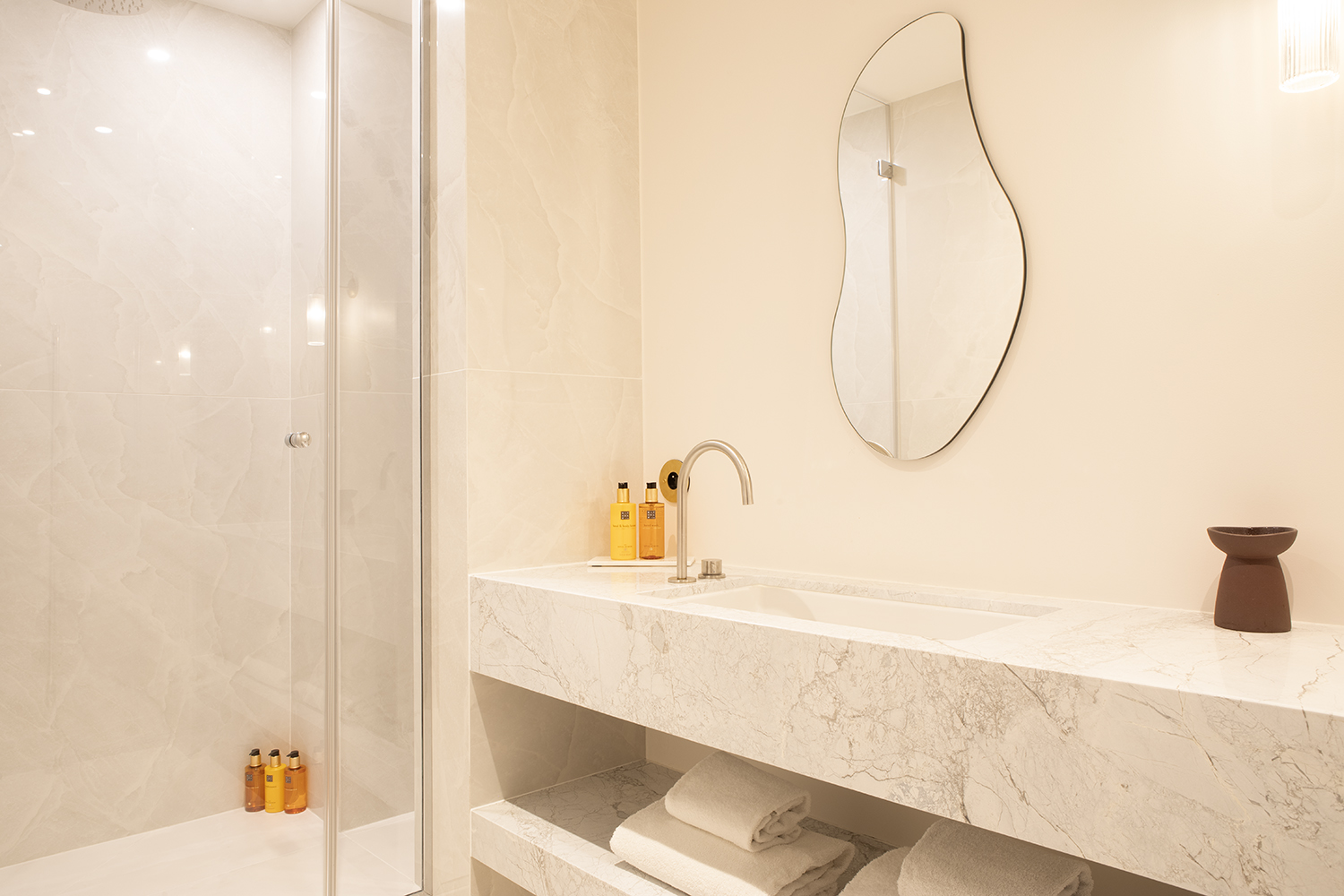 The three bedrooms are equipped with hotel-quality queen-size beds, smart TVs and plenty of storage space. Each has its own marble bathroom with walk-in shower.